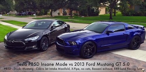 前型フォード「マスタング」の5Lエンジン搭載モデルと、走りに定評ある電気自動車テスラ「モデルS P85D」のドラッグレースバトル 大排気量NAの低速トルクと電気自動車は